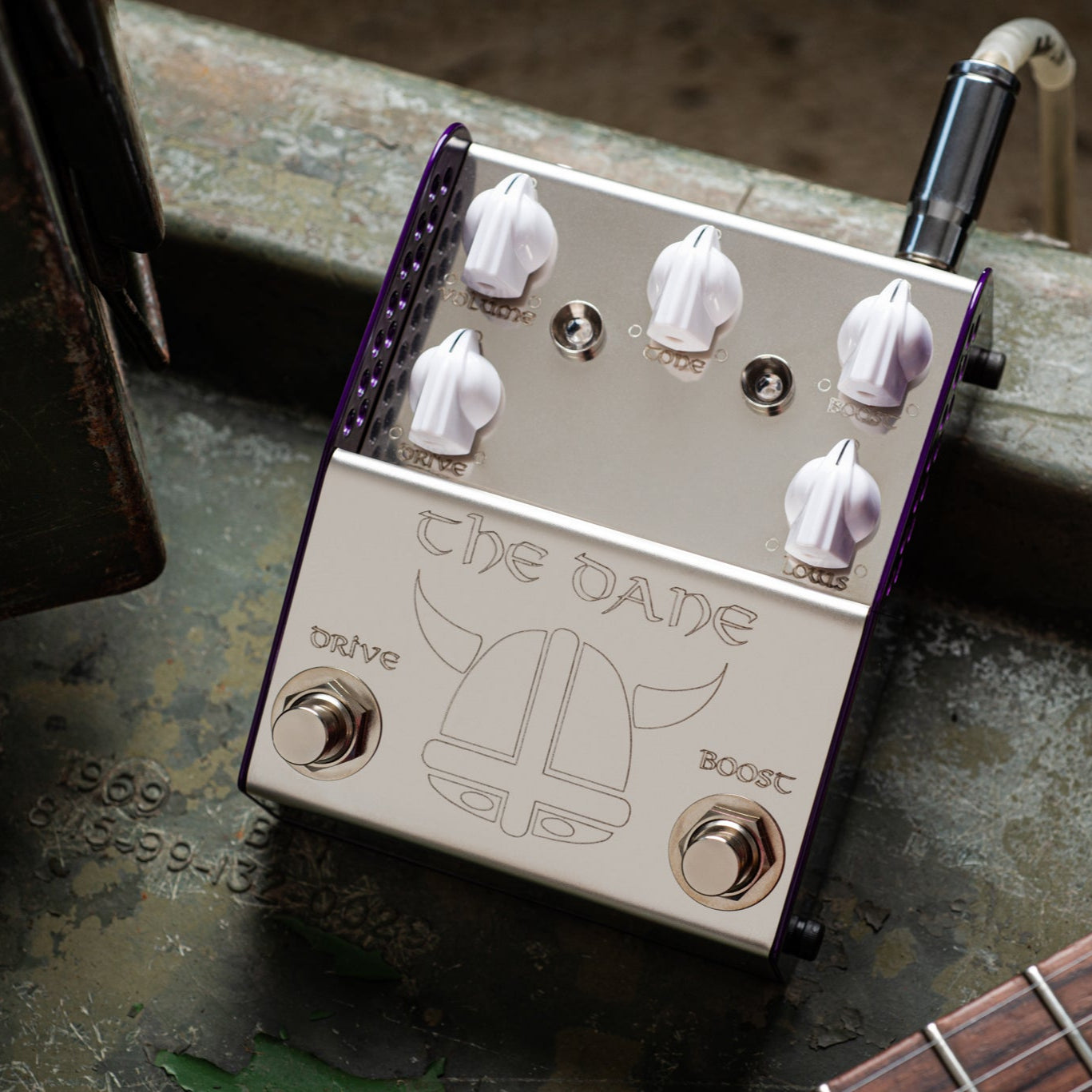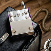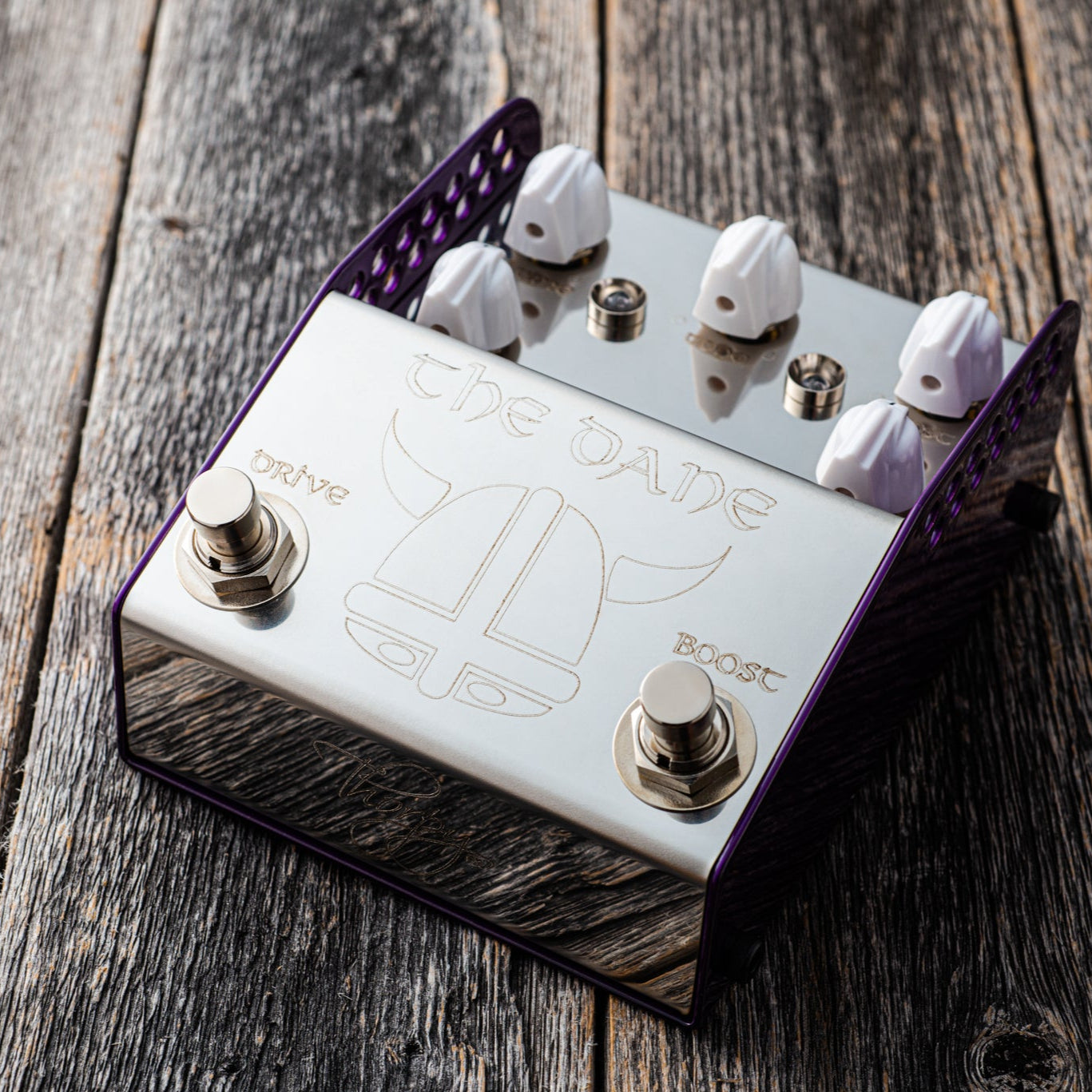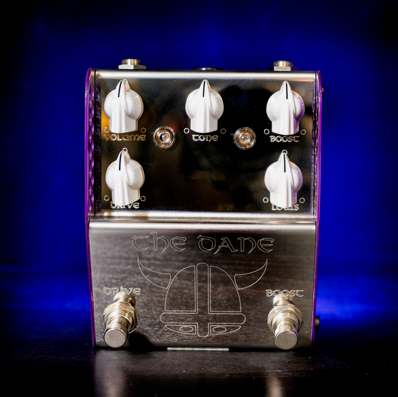 THE DANE is a creation designed to meet the exacting needs of Danish Pete. However due to the design brief needing to cover the wide palette of sounds he uses, the pedal finished up being the most versatile pedal available on the market for such a clean design. THE DANE has two sides - a complex light to medium gain overdrive on the left and a high headroom super clean boost on the right. The pedal is designed so that the boost runs into the drive side. This yields three distinct tonal variations ranging from clean boost all the way through to full and fat saturation. The pedal is also designed to clean up impeccably from your volume control and as such it is ideal for dynamic players who like to adjust their playing style.