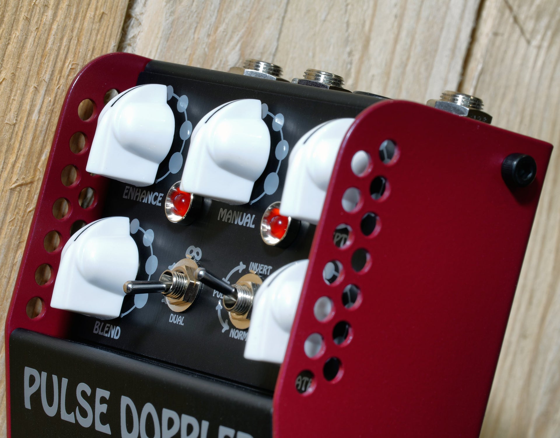 With rotary controls for Depth, Rate, Blend, Enhance, and Manual coupled with two toggle switches and two footswitches this analog pedal keeps it functionally simple but is a deceptively feature packed beast. For stereo pedal enthusiasts, they will be pleased to know that the Pulse Doppler has both dry and wet outputs. This pedal allows you to deliver an almost unlimited tonal pallet no matter what your mood/style or guitar and amp setup. The premium sound is enhanced through the use of premium components all wrapped in a beautiful custom engineered enclosure.