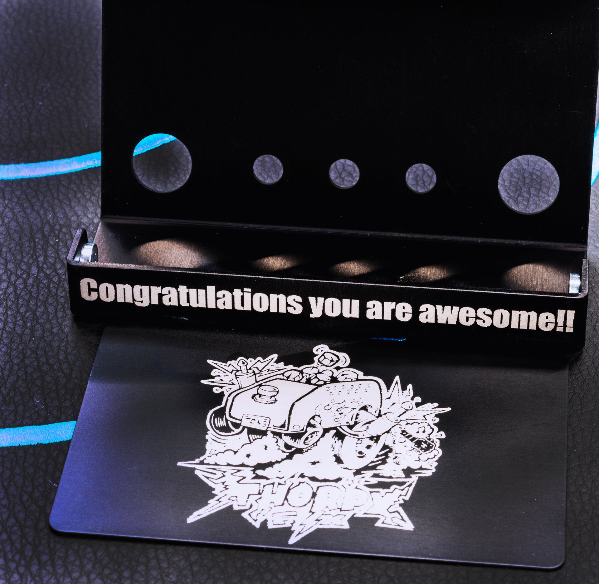 - Um belo gabinete de alumínio anodizado preto cortado a laser envolto em uma base laranja metálica.