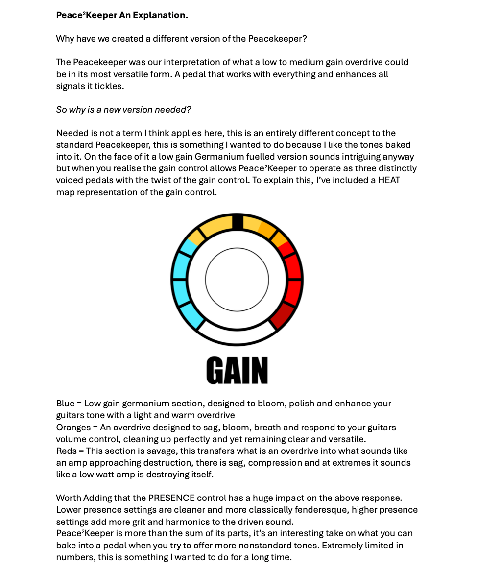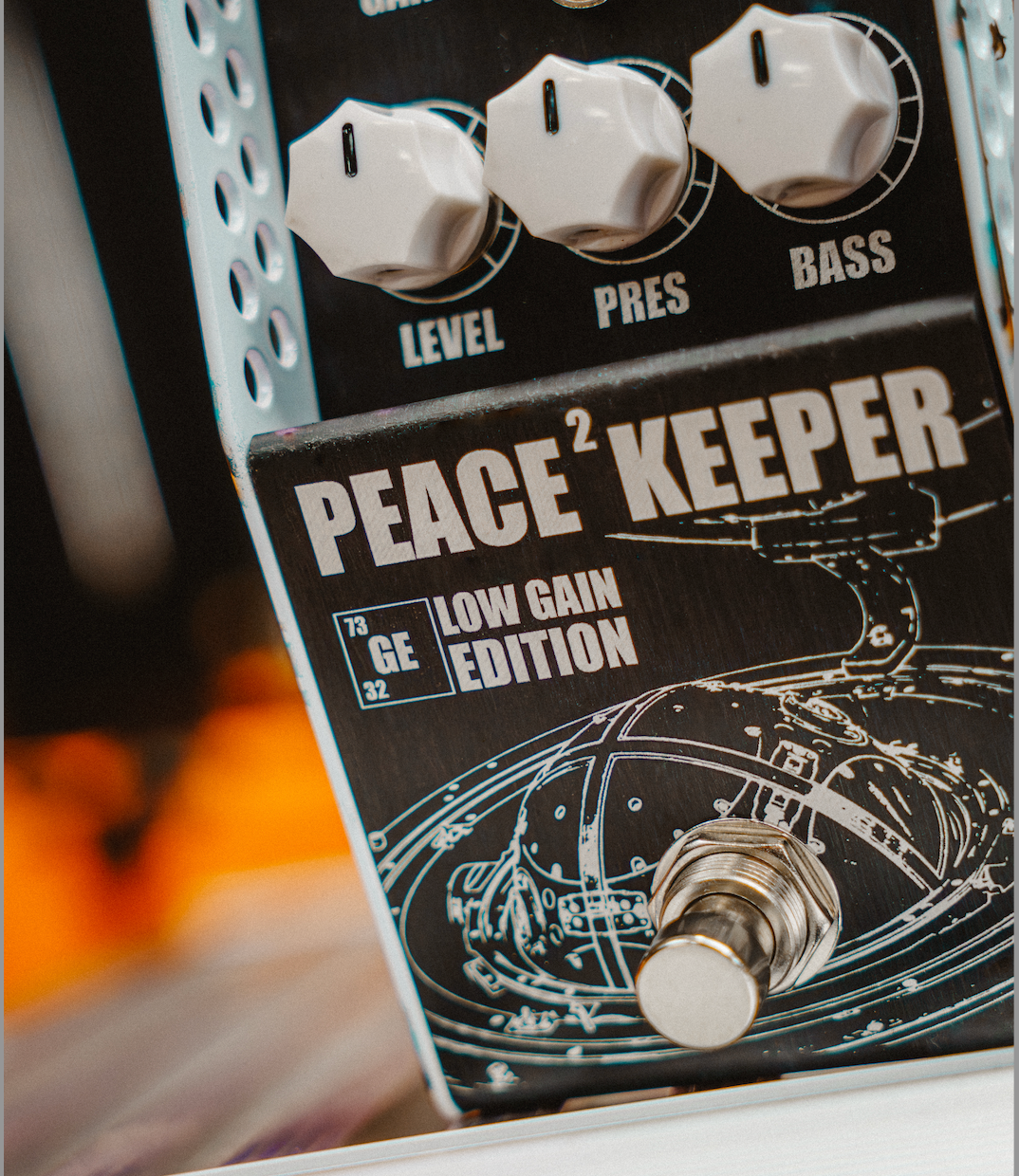 O PEACEKEEPER é a nossa versão de um overdrive de baixo ganho projetado para se adequar a todas as guitarras e amplificadores, ao mesmo tempo em que oferece os tons mais suaves que você já ouviu. Hipérbole à parte, este pedal tem alguns truques muito astutos na manga, combinando um circuito ativo de agudos e graves pós-ganho com um controle de presença/médios pré-ganho, você pode adaptar o caráter de overdrive e a tonalidade às suas necessidades exatas. O controle de médios de pré-ganho permite que você mude de um tipo de ganho médio muito suave para um ganho médio mais pronunciado com todas as sutilezas intermediárias. Pós-ganho, os controles ativos de agudos e graves adaptam esse estágio de ganho focado para alcançar a tonalidade que você deseja/precisa. Usado como um impulso sutil em seu amplificador (estilo ala Klon) ou como um overdrive "on the Edge", o PEACEKEEPER fará você se perguntar como você soa tão bem!