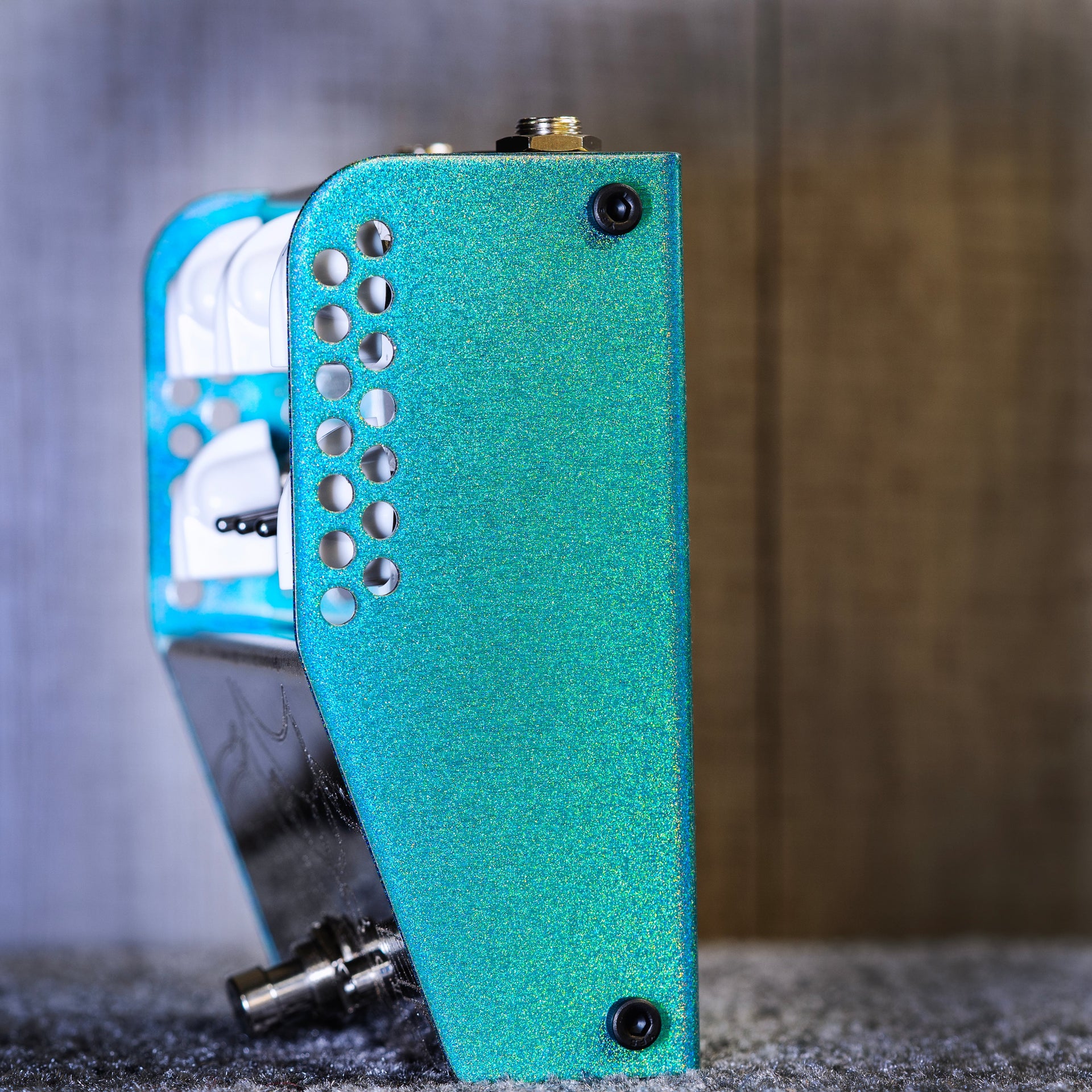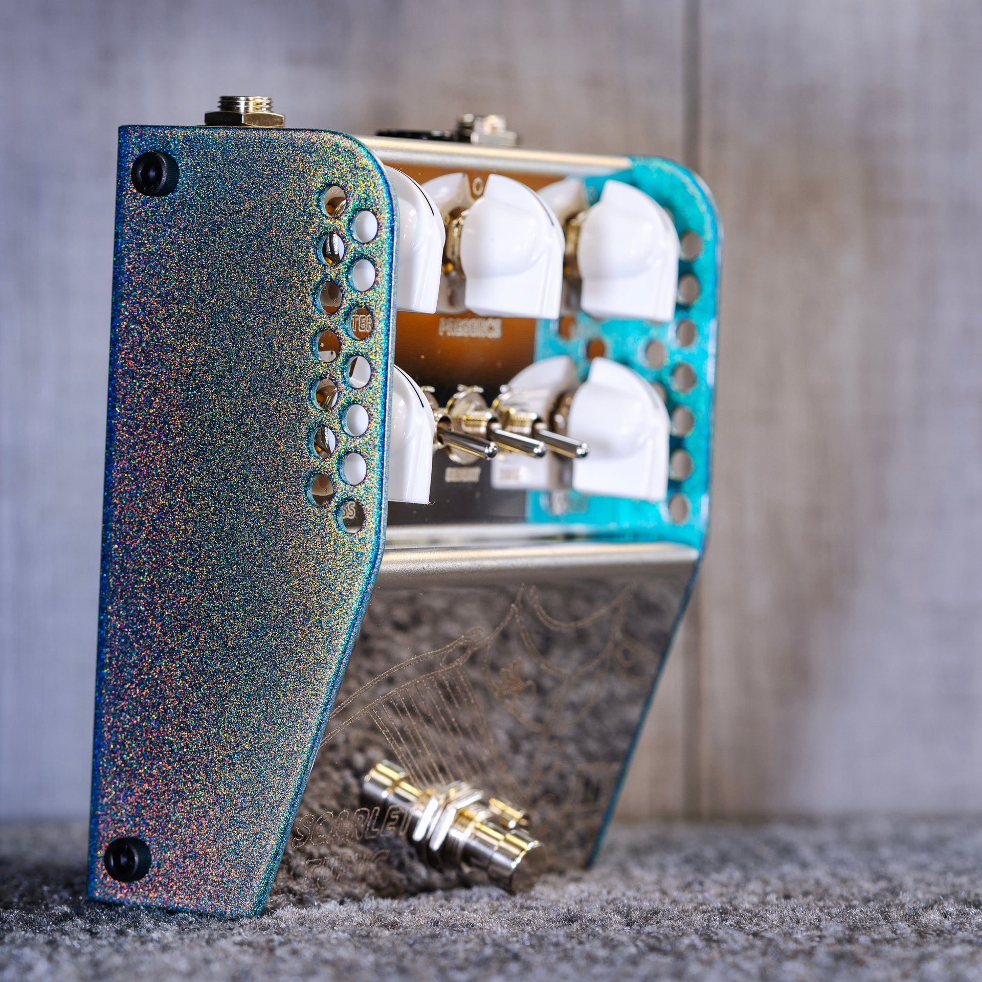Este é um pedal que descrevo como um emulador de amplificador analógico. O projeto surgiu inicialmente quando nos pediram para criar um pedal que emulasse um amplificador raro chamado Selmer Treble and Bass 50. O jogador em questão (Lee Harris - Saucerful of Secrets) queria um pedal que lhe fornecesse os timbres de amplificador vintage Syd Barret usado no início da música Pink Floyd. Isso foi para que ele pudesse soar autêntico enquanto tocava na Saucerful of Secrets World Tour. No desenvolvimento do pedal, garantimos que o Selmer fosse coberto tonalmente, mas, como sempre, fomos além do escopo inicial do design. Assim, assim como o Selmer Amp, também garantimos que os timbres do estilo DR103 e AC30 pudessem ser capturados com sucesso. Equipado com um transformador de alta qualidade, o pedal reage ao seu toque e distorce como um amplificador de tamanho normal.